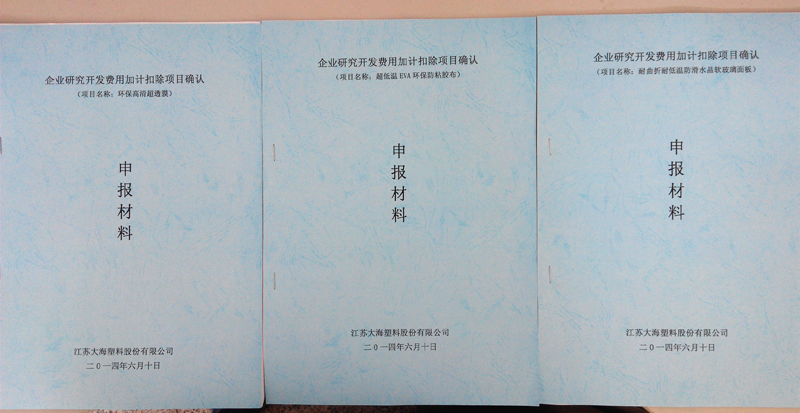 為鼓勵(lì)企業(yè)開(kāi)發(fā)新技術(shù)、新產(chǎn)品、新工藝等研發(fā)創(chuàng)新工作,區(qū)科技、稅務(wù)部門聯(lián)合出臺(tái)文件,對(duì)企業(yè)由研發(fā)創(chuàng)新項(xiàng)目而發(fā)生的研發(fā)費(fèi)用,在計(jì)算應(yīng)納所得稅額時(shí)給予加計(jì)扣除。公司去年下半年申報(bào)此類項(xiàng)目1 個(gè),已經(jīng)獲得了抵扣稅的優(yōu)惠。 5月底,公司根據(jù)已經(jīng)申報(bào)的專利產(chǎn)品,又申報(bào)了3項(xiàng)加計(jì)扣除項(xiàng)目。它們分別是:環(huán)保高清超透膜;超低溫EVA環(huán)保防粘膠布;耐曲折耐低溫防滑水晶軟玻璃面板。3個(gè)項(xiàng)目的研發(fā)費(fèi)用合計(jì)398萬(wàn)元。目前,這3個(gè)項(xiàng)目已經(jīng)區(qū)科技局審批,公司將憑批件向稅務(wù)部門申辦相關(guān)抵扣稅的手續(xù)。